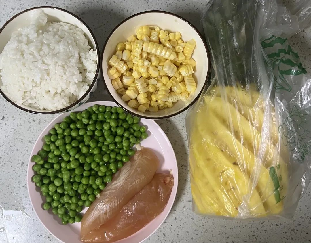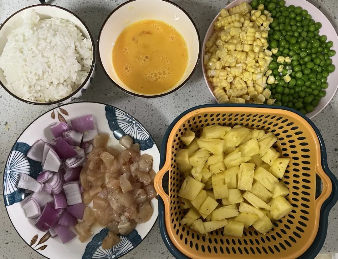 准备材料:菠萝、玉米、豌豆、洋葱、鸡蛋、鸡胸肉