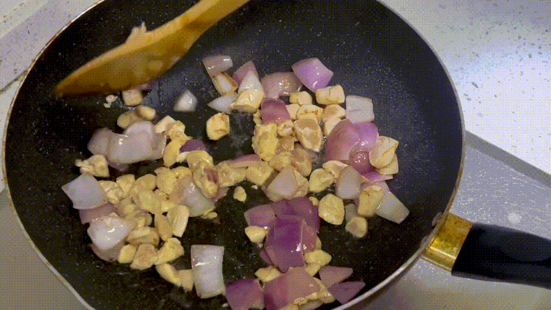 倒入适量油、洋葱、鸡胸肉一起煸炒。
