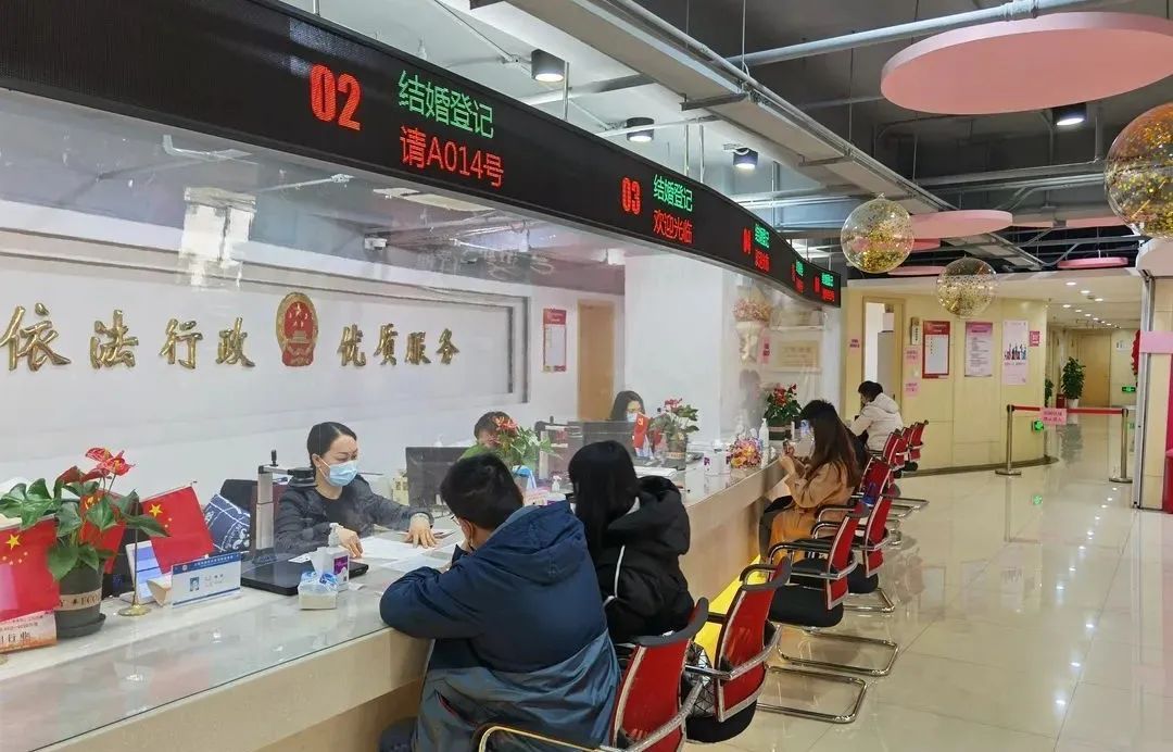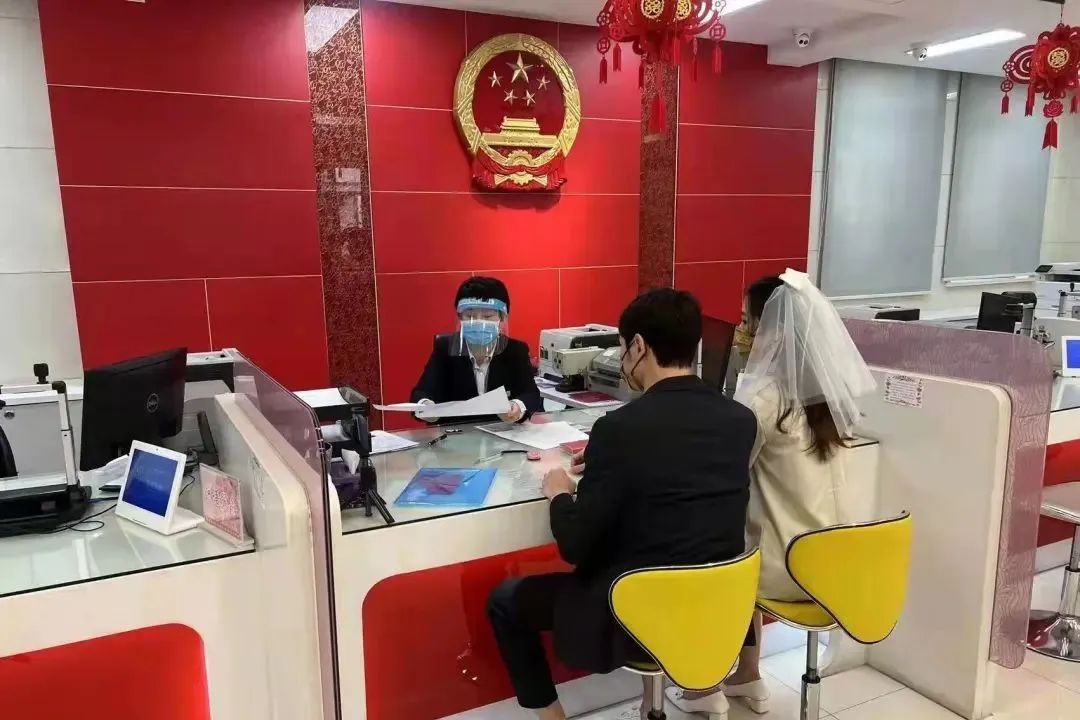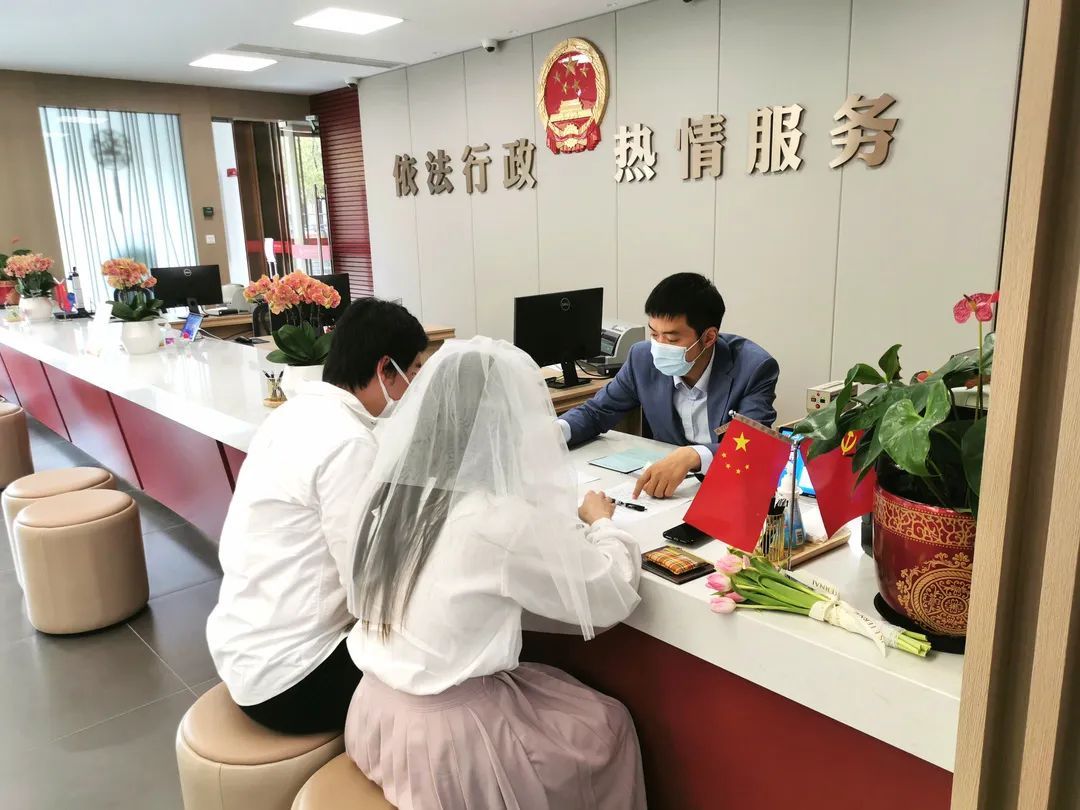在这里,工作人员也见到了爱情最美好的模样——一对新人为了确保预约日能顺利登记,提前住到了中心附近的酒店;有的情侣看到中心正常开放,就决定拿上户口簿,立即预约领证;有对新人拿着捧花在服务大厅拍照留念……“面对这些美好的爱情,我们要努力成为新人们的坚强后盾。”