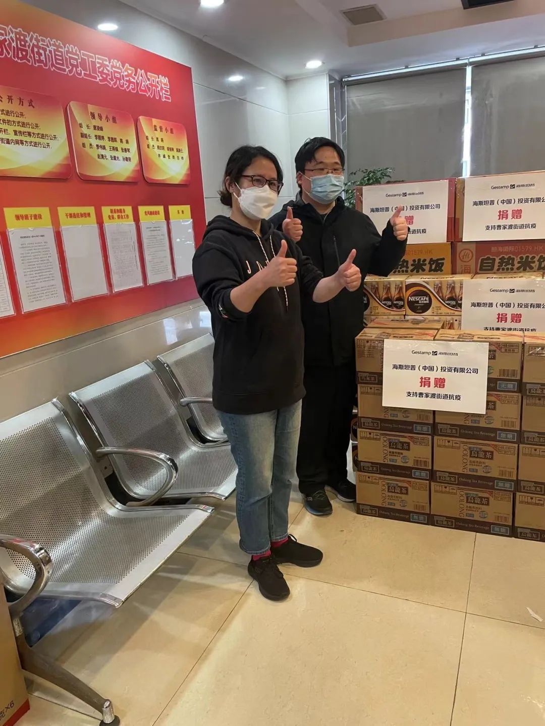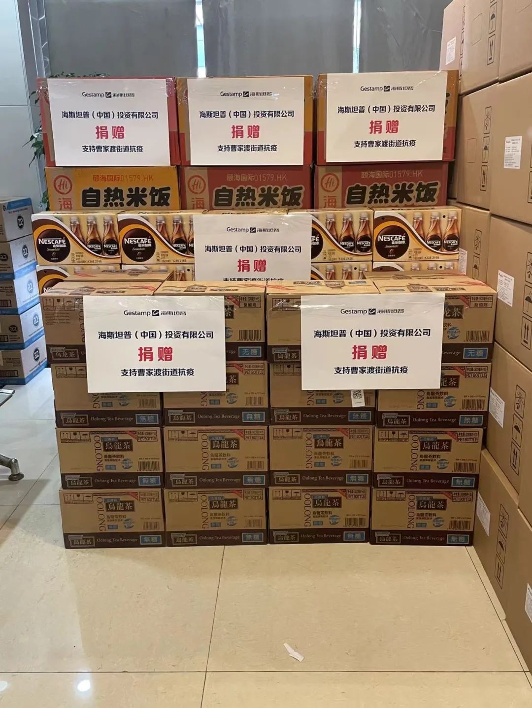 3月28日,海斯坦普(中国)投资有限公司为静安区卫生健康委员会、曹家渡街道、天目西路街道及周边小区身处防疫一线的志愿者、社区工作人员等,捐赠了共计500箱、总价值近十万元的防疫物资,其中包含乌龙茶、咖啡等饮料,以及自热米饭等食物,为他们送去便利与温暖。