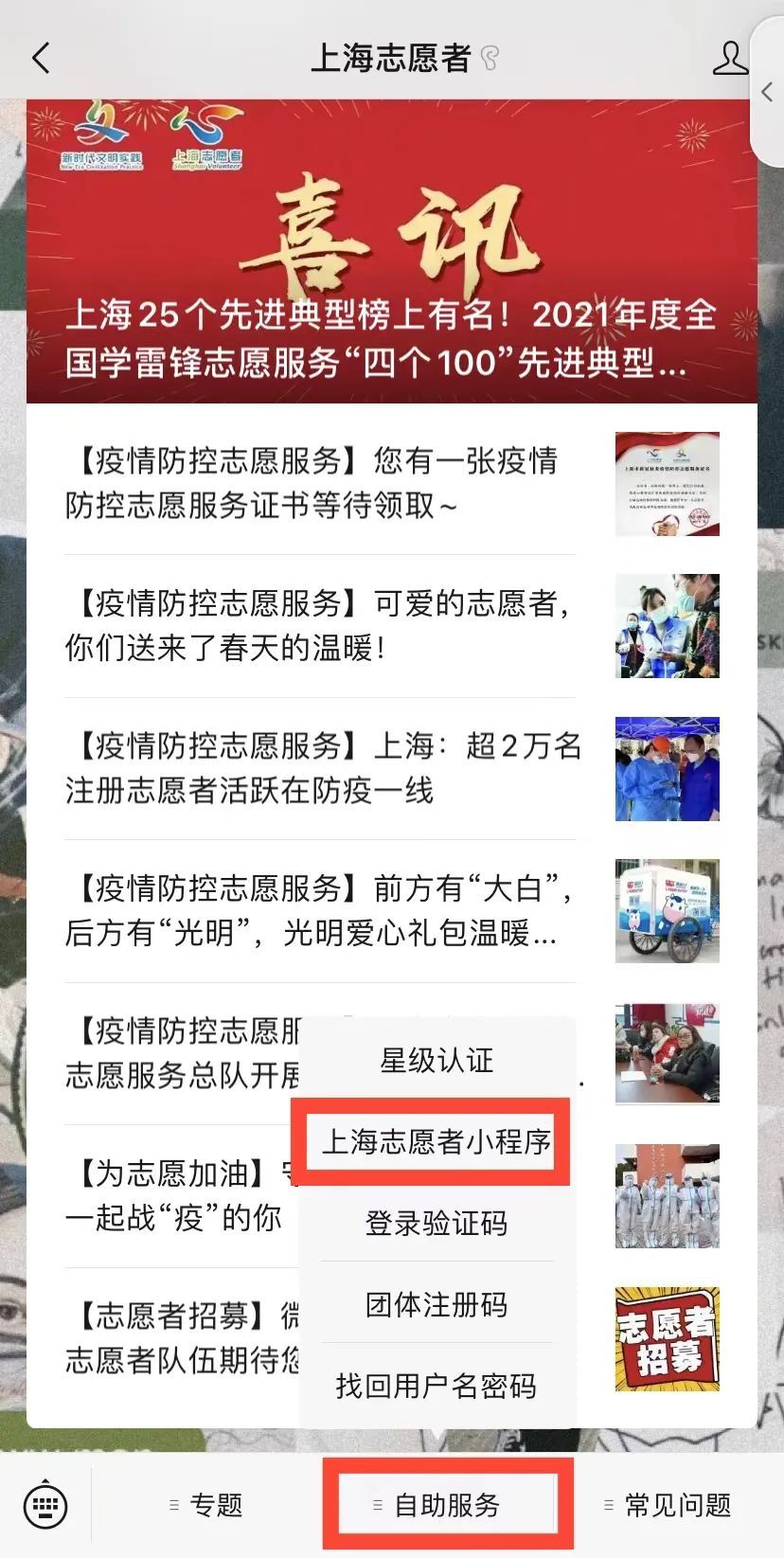 也可关注“上海志愿者”微信公众号,点击底部菜单“自助服务”-“上海志愿者小程序”进入页面。