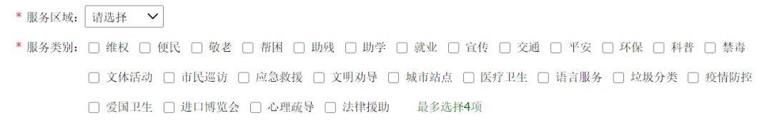填写志愿者所在服务区域和服务类别