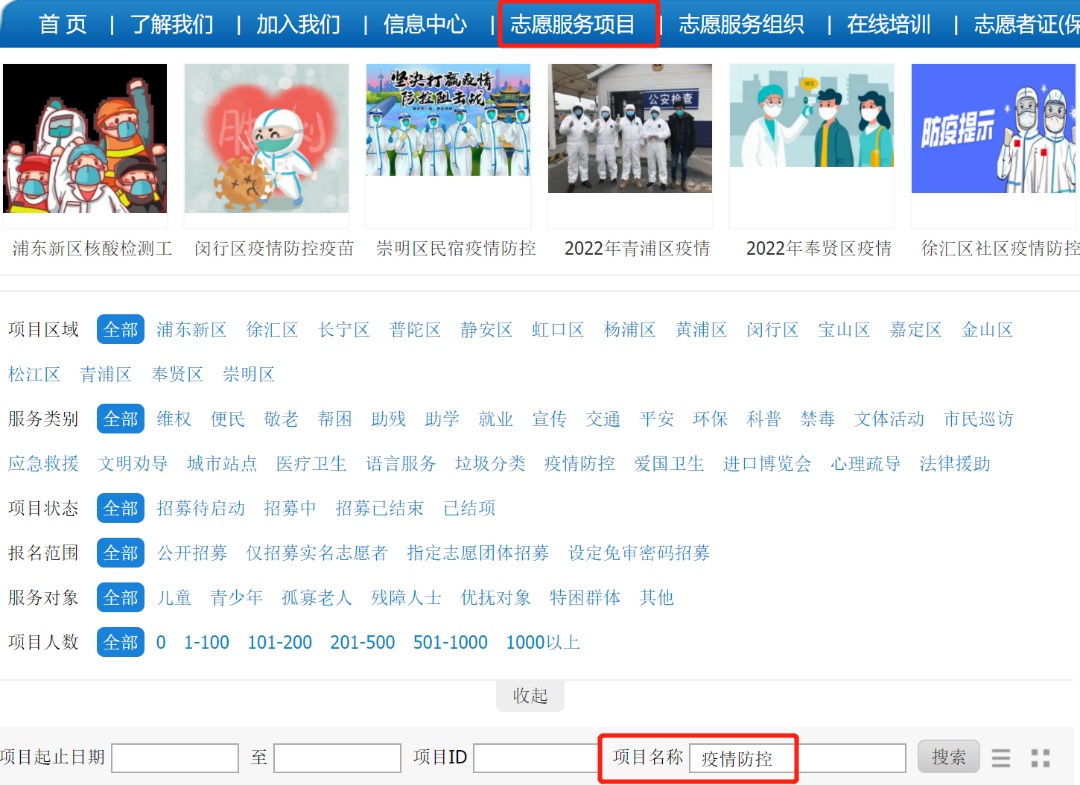 登录个人账户,点击“志愿服务项目”,在项目名称中输入关键词“疫情防控”进行搜索。