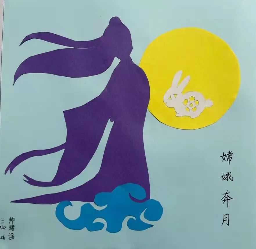 三(3)班的帅珺涵在深紫色的纸上画了飘逸飞舞的嫦娥,在白纸上画出活泼可爱的小白兔,明黄色纸上画一轮明月,湖蓝色纸上画一朵古典的祥云图案,再把这些图案剪下来。