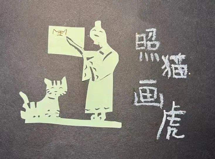 三(2)班的朱凝暄同学想要用剪纸展现的成语是“照猫画虎”。