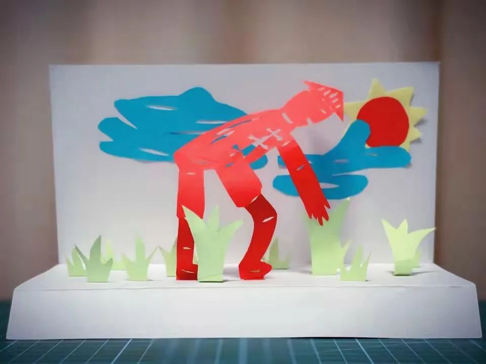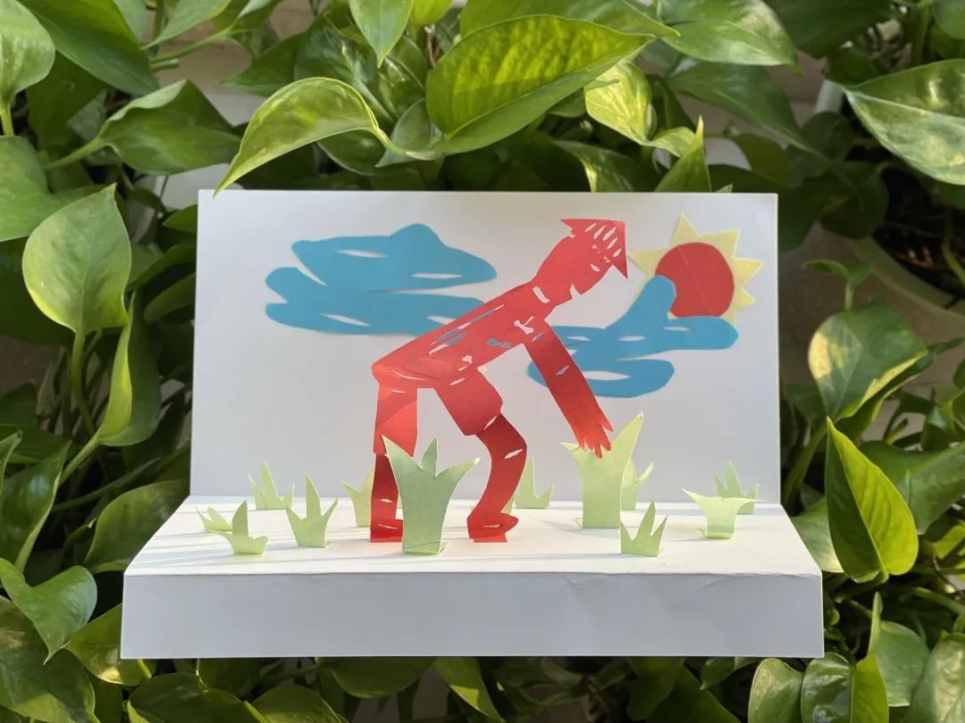 他还介绍说,因为传统剪纸都是红色的,所以,农民伯伯选用了红色,而禾苗、太阳和云朵用其他颜色,这样人物主角突出,作品色彩也丰富。
