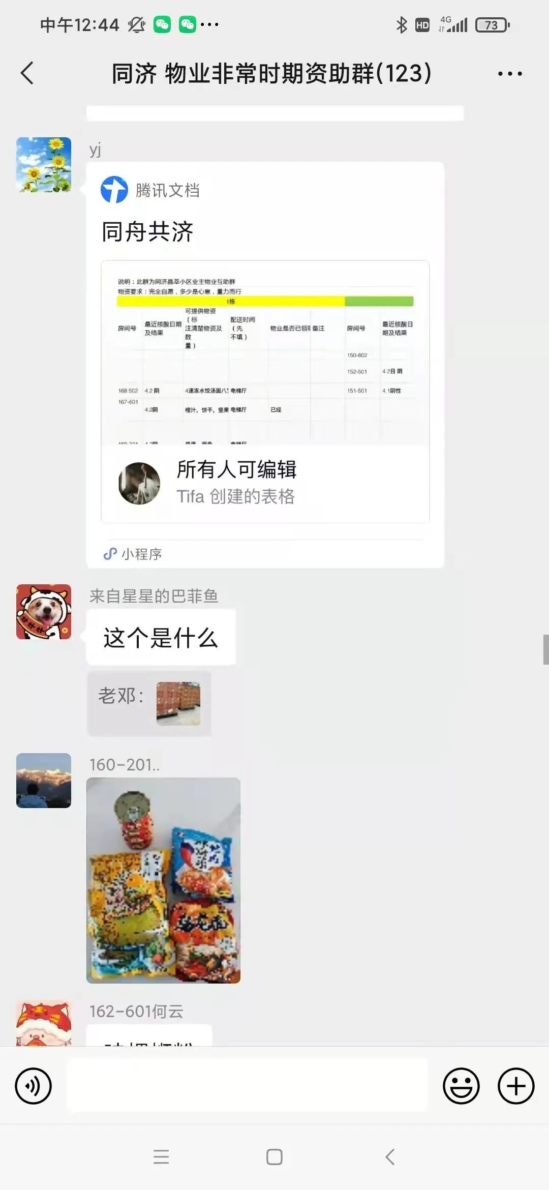 原来,考虑到封控期间生活物资采购不方便,住户家里的现有存量富余程度也各不相同,于是社区物业牵头组建了一个“同舟共济”物资捐助群,大家通过共享文档,可以自行填写可捐赠的物资和所需要的物资,由物业上门回收和派送,让闲置的物资充分流动起来,帮助到真正需要帮助的人。