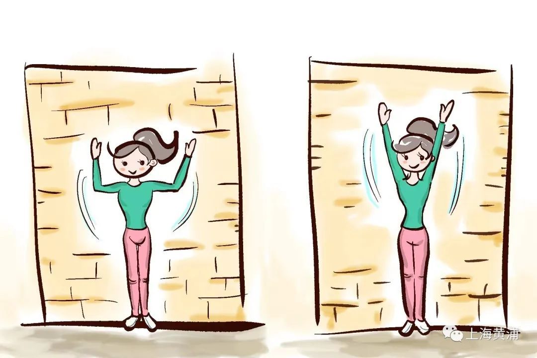 3. 靠墙天使:背部紧贴墙面,双手侧平举,向上屈肘90°,掌心朝前,将手臂完全贴住墙面;同时手臂向上沿墙壁向上伸展,然后按原路慢慢回到起始位置,重复进行。