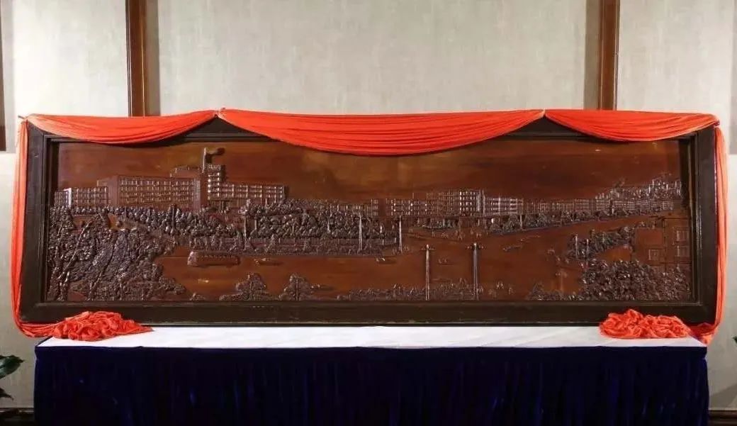 大型黄杨木浮雕《闵行卫星城落成图》长276厘米,宽83厘米。系当年闵行卫星城建成时由多位工艺美术大师合作雕刻而成,这幅作品再现了“闵行一条街”如火如荼的建设场面,非常珍贵难得。
