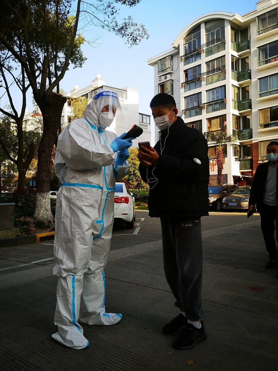延吉物业保安部接到疫情命令后24小时安排保安在现场维持秩序,并且帮助整理移动所有阻碍通行的车辆,他们几个人一组搬运电动车和自行车,衣服撕破了,手被划破了没有人吱声,大家心中都有一杆秤,秤的那头是疫情和群众的健康。