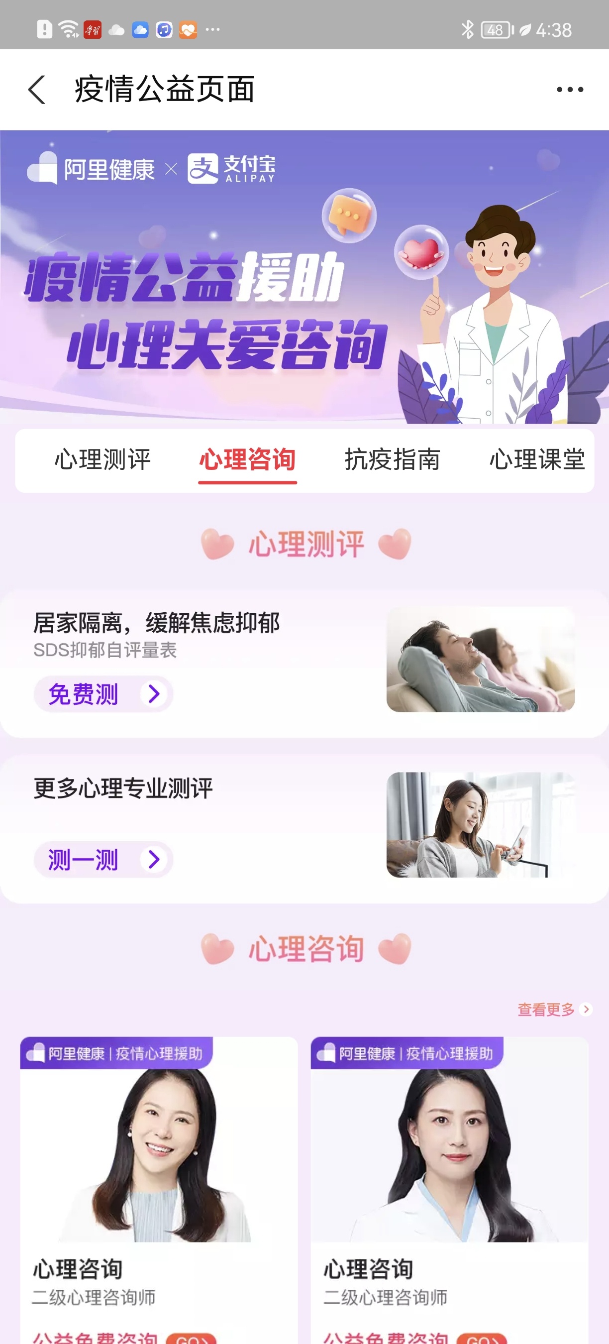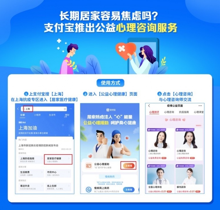 支付宝和阿里健康发起公益心理咨询,用户在支付宝上搜索“上海”,进入“居家医疗健康”板块,即可选择公益心理援助。德瑞姆心理提供了免费心理咨询,德瑞姆心理和壹点灵心理咨询提供了1分钱的心理咨询。