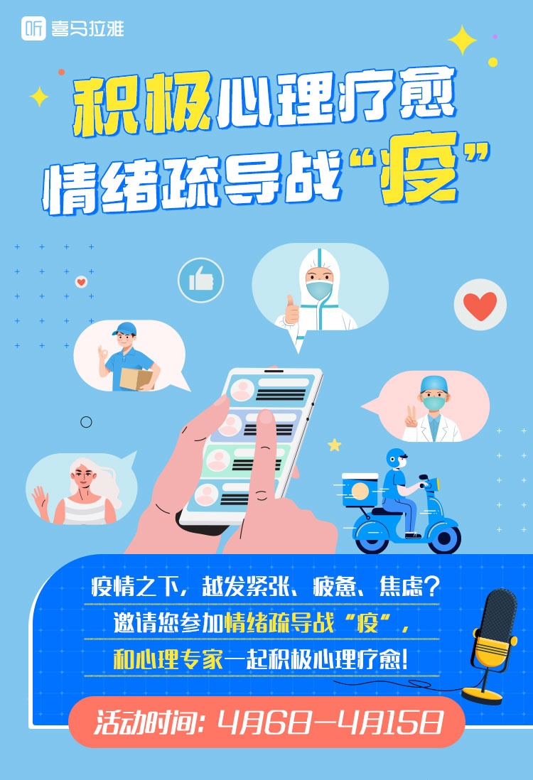 疫情之下,喜马拉雅发起的“积极心理疗愈 情绪疏导战‘疫’”直播活动也在进行中,邀请多位心理专家、心理咨询师,在直播中以圆桌分享、在线解答用户问题等形式,给疫情期间的用户以心理支撑和情绪安抚。活动期间,打开喜马拉雅App,搜索关键词“情绪疏导”即可收听直播并与主播连麦。