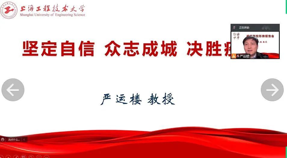 学生家长——上海工程技术大学教授严运楼也举办了家长“云课堂”,做了《坚定自信 众志成城 决胜疫情》的主题报告,重点讲解了当前上海疫情防控形势,全市上下众志成城,千方百计集中资源和力量,着力打赢疫情防控攻坚战。