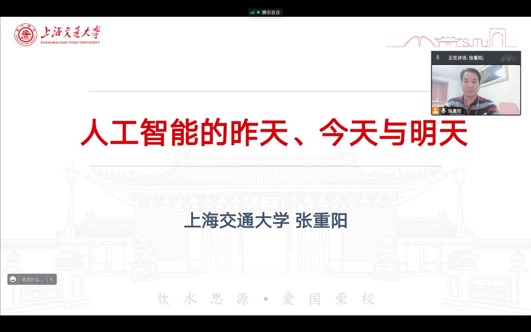 学生家长——上海交通大学人工智能研究院教授张重阳,以“人工智能的昨天、今天和明天”为题,通俗易懂地向同学们介绍了人工智能的基本概念和原理,分享了人工智能“三起三落”的发展历史,并通过图片、视频生动地展示了人工智能在医疗诊断和疫情防控等领域的应用效果。