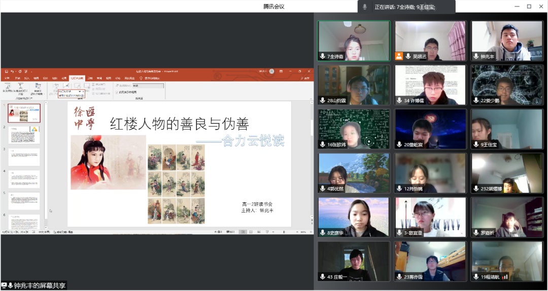 徐汇中学高一(2)班钟兆丰同学说,“在云‘悦’读活动中,我由台下的聆听者变为了台上的演讲者、主持人。在为选题准备的过程中,不仅丰富了自己的知识,对文学作品相关情节有了更全面深入的理解。通过线上云悦读活动,知识不再只是老师口中的一个个知识点,而是我们在探究,合作,思考中得来的切实收获。”