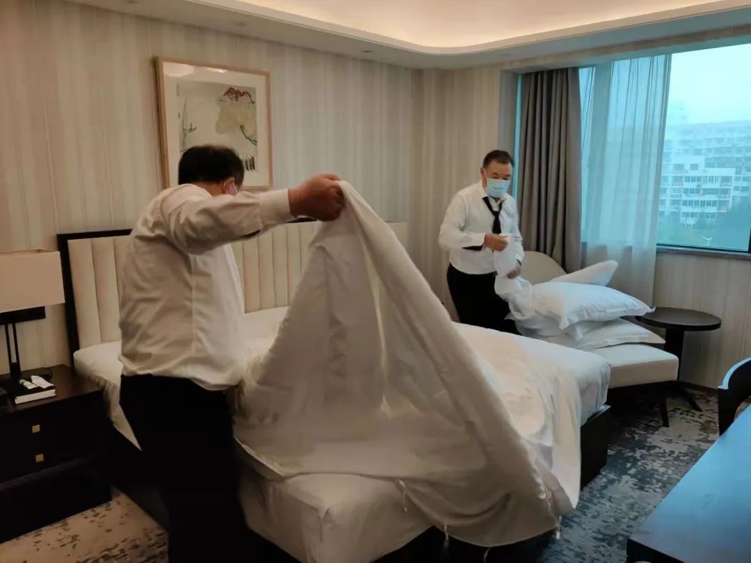 金山宾馆邀请援沪医疗队进行专业培训,进一步规范环境卫生消杀和个人防护措施落实。