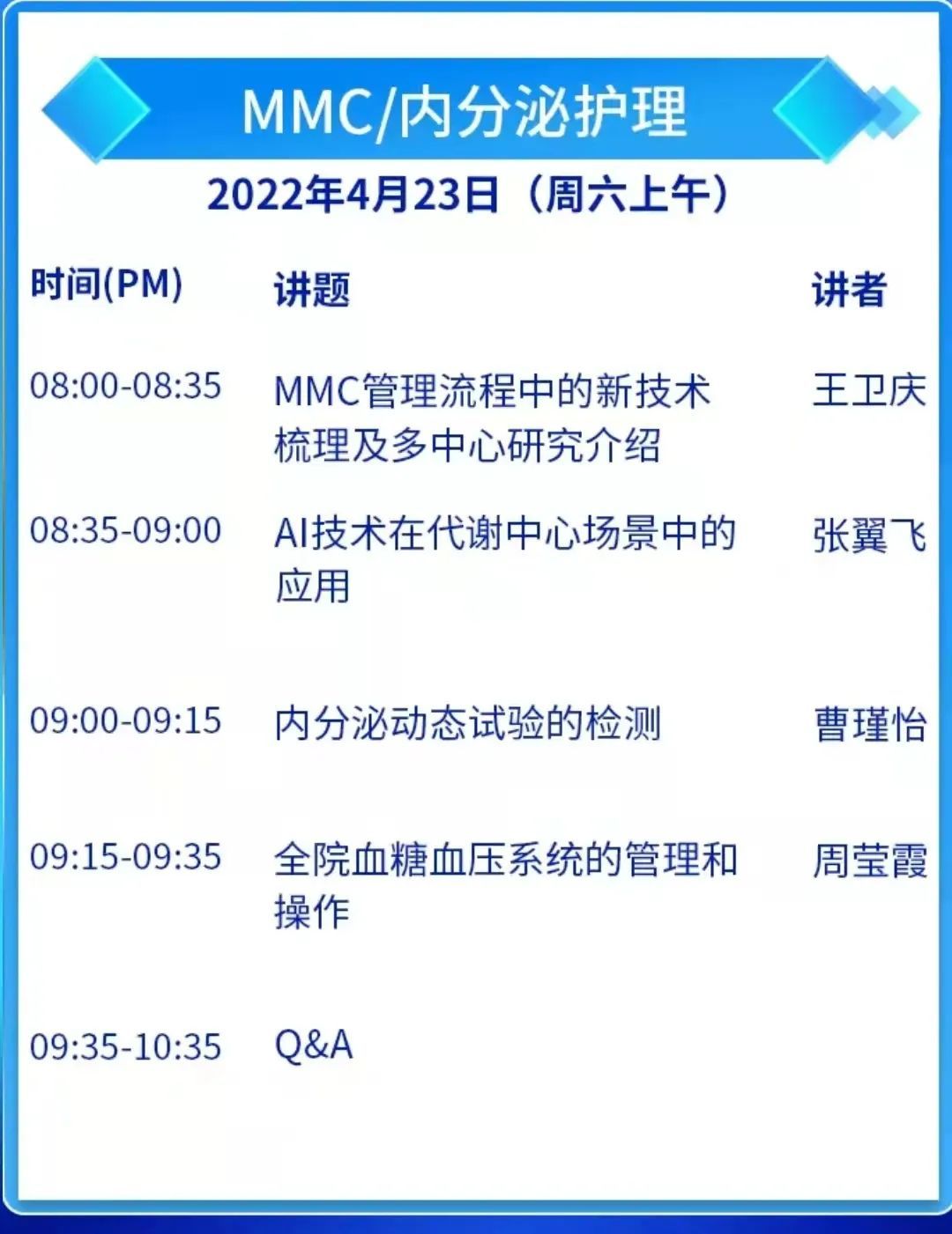 本次学习班以内分泌诊疗技术为特色,包括流行病学专题、骨代谢疾病专题、糖尿病肥胖专题/内分秘检测专题、甲状腺疾病/糖尿病足、MMC/内分泌护理、β细胞/性腺疾病专题、肾上腺疾病/基因组学专题/影像学、内分泌代谢病合并妊娠临诊应对八个专题。