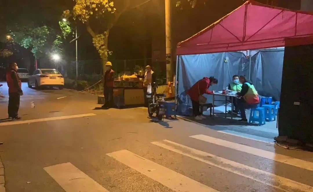料峭春寒,他们是道口“守夜人”。一顶简易帐篷、一排隔离护栏、一盏灯、一套桌椅 、一本登记册、一个烧水壶,这是金岭公司员工志愿者们在朱泾镇前进路道口24小时坚守的阵地。自3月18日第一轮全员核酸筛查以来,陈爱弟就火速组织员工分两班分别值守南圩路和前进路道口,最近又与茸山公司抱团应援,协助社区开展管控。前进路道口其实也是附近秀州新村开放式老旧小区现在唯一一个出入口,志愿者们严格落实“一戴三查”,并做好登记,同时对快递包裹进行消杀后,再递送给居民。