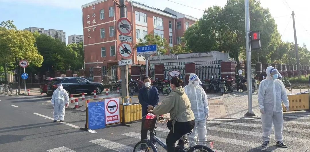 在健康南路(北道口),全国文明单位上海永太服装金山有限公司党支部书记、董事长李长虹组织党员、员工志愿者4到5人为一班,同样加强值守。从早上7时到晚上7时,不放过一个细节,不忽视一个漏洞。该道口是前往市六人民医院金山分院的必经之路,每当去医院看病、做核酸筛查人流高峰时,志愿者们总是不间断地对来往市民、车辆进行严格检查,守好进入朱泾的第一道关口。