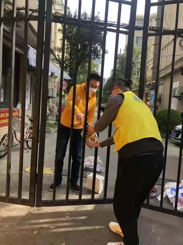 △因为疫情封控,配送员们通过大门栏杆为封控区里面居民送上鲜牛奶