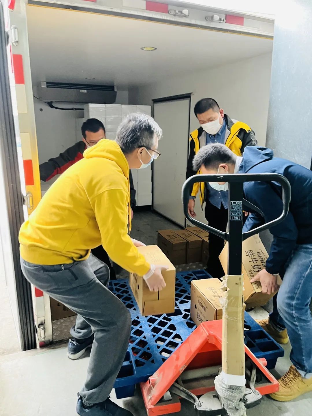 △工作人员正在从车里搬出妙可蓝多奶酪棒,准备进行配送
