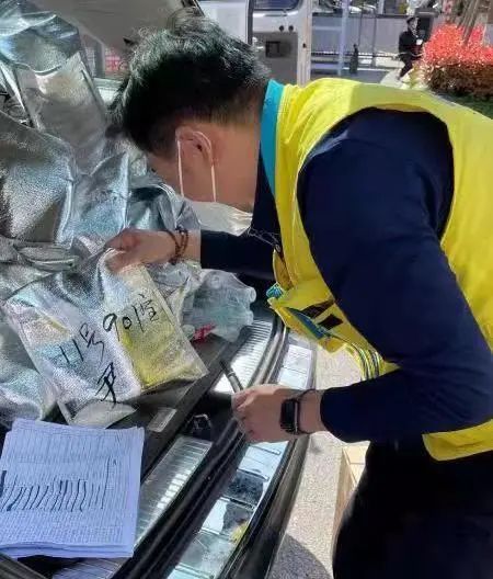 △蒙牛配送员在仔细核对包装袋上的配送信息,将物品准确无误的配送到每家每户