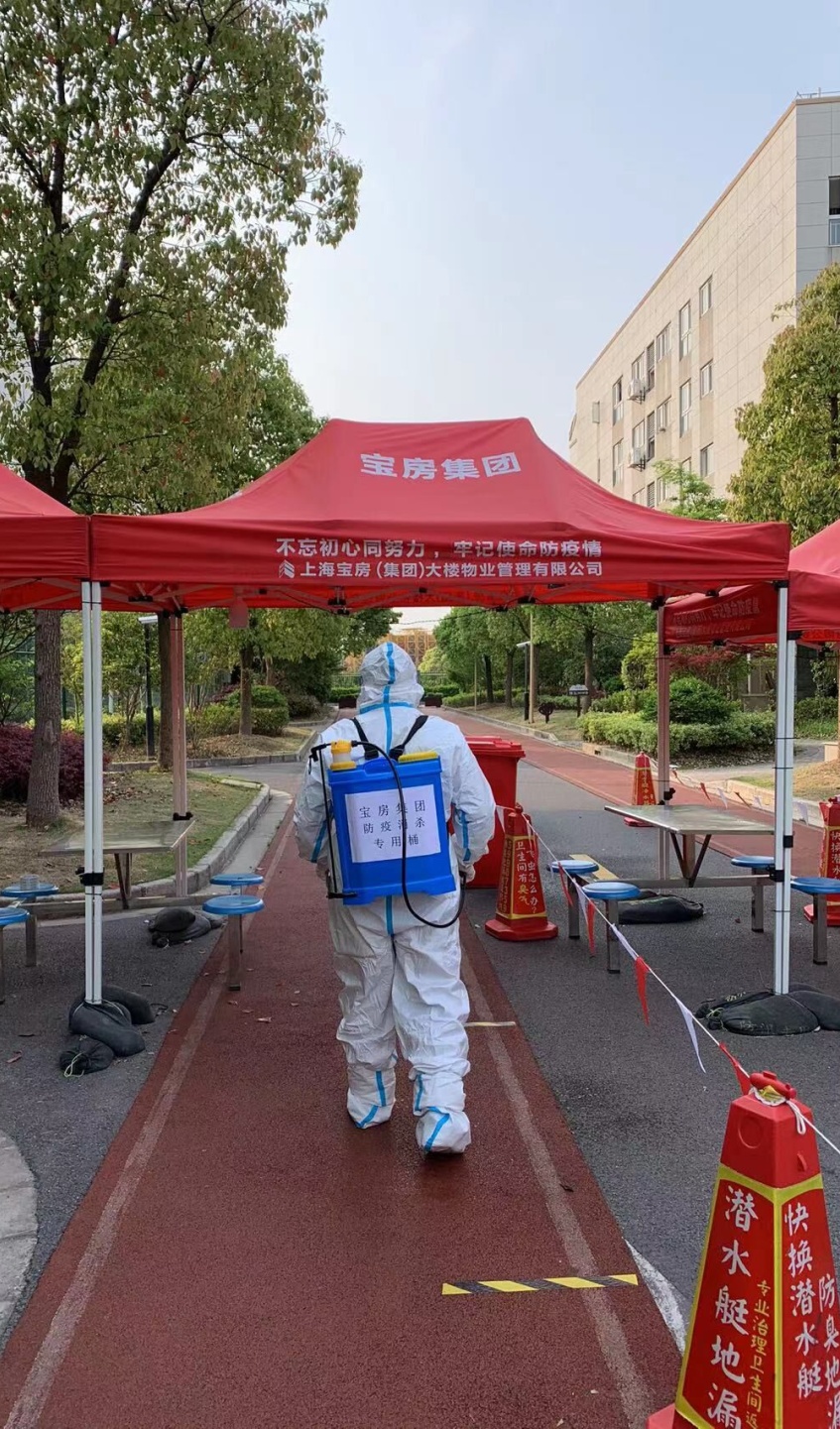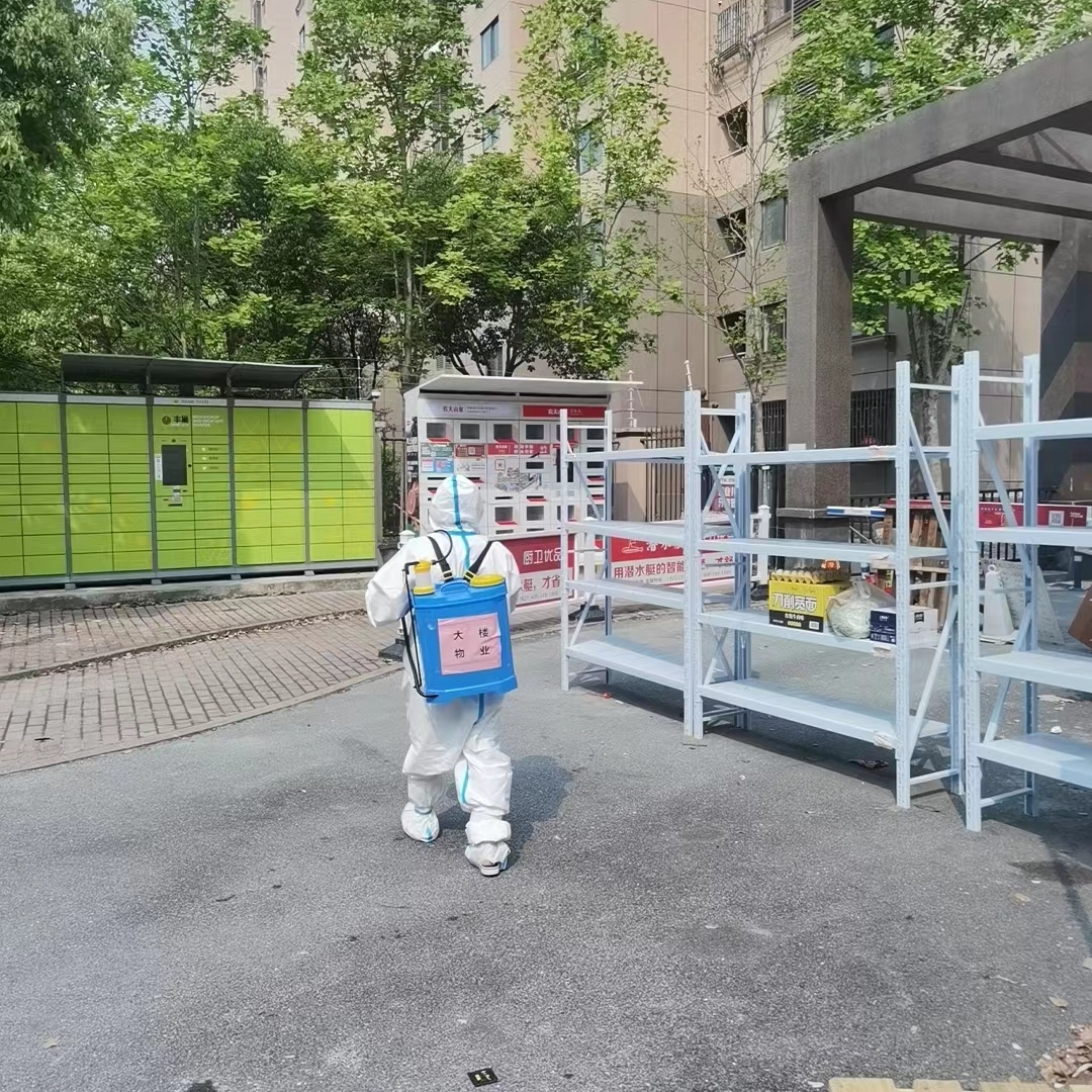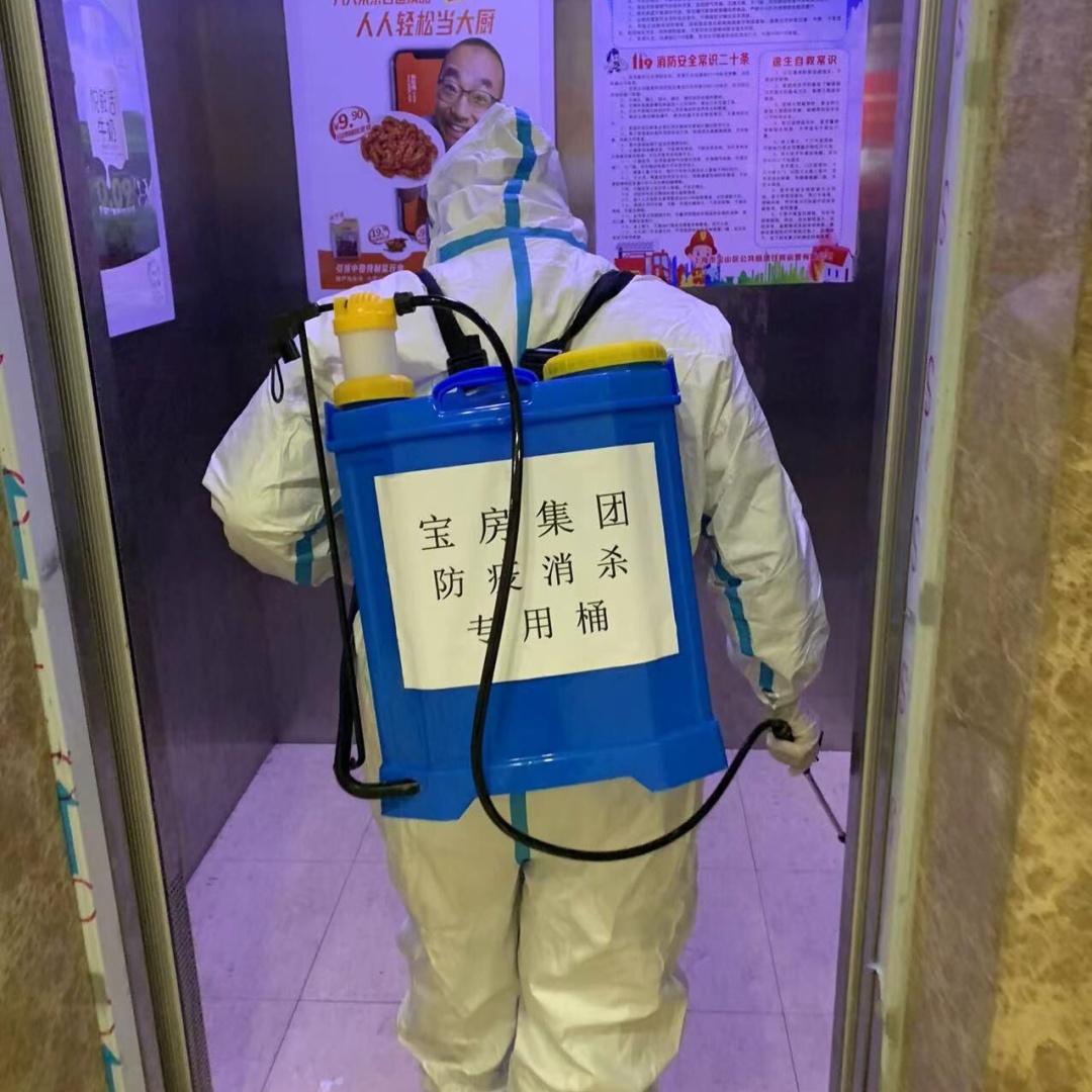 疫情就是命令,防控就是责任。大楼物业志愿者背着沉重的消毒设备,对小区公共部位、非阳性楼道进行消杀。