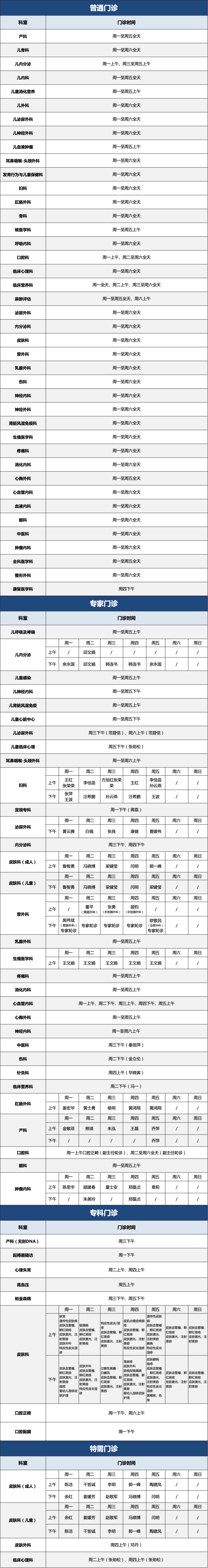 2、普通门诊、部分专家门诊、专科门诊继续开设。部分特需门诊恢复开设,具体排班见文末排班表。