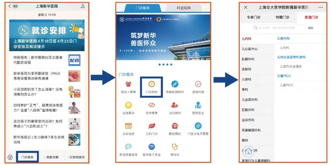 门诊预约请从“上海新华医院”微信服务号进入,点击“门诊服务”—“门诊预约”。