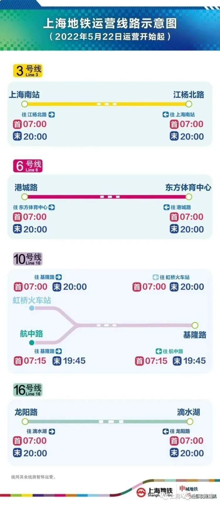 上海地铁刚刚宣布,自5月22日起, 上海轨道交通3号线、6号线、10号线、16号线恢复运营,运营时段均为7:00-20:00,其它线路仍暂停运营。后续,上海地铁将根据疫情防控形势,适时调整运力,或增加恢复运营线路。