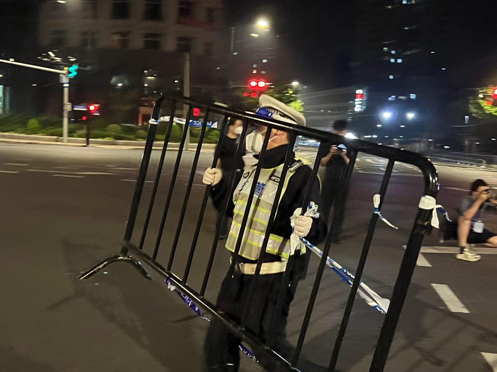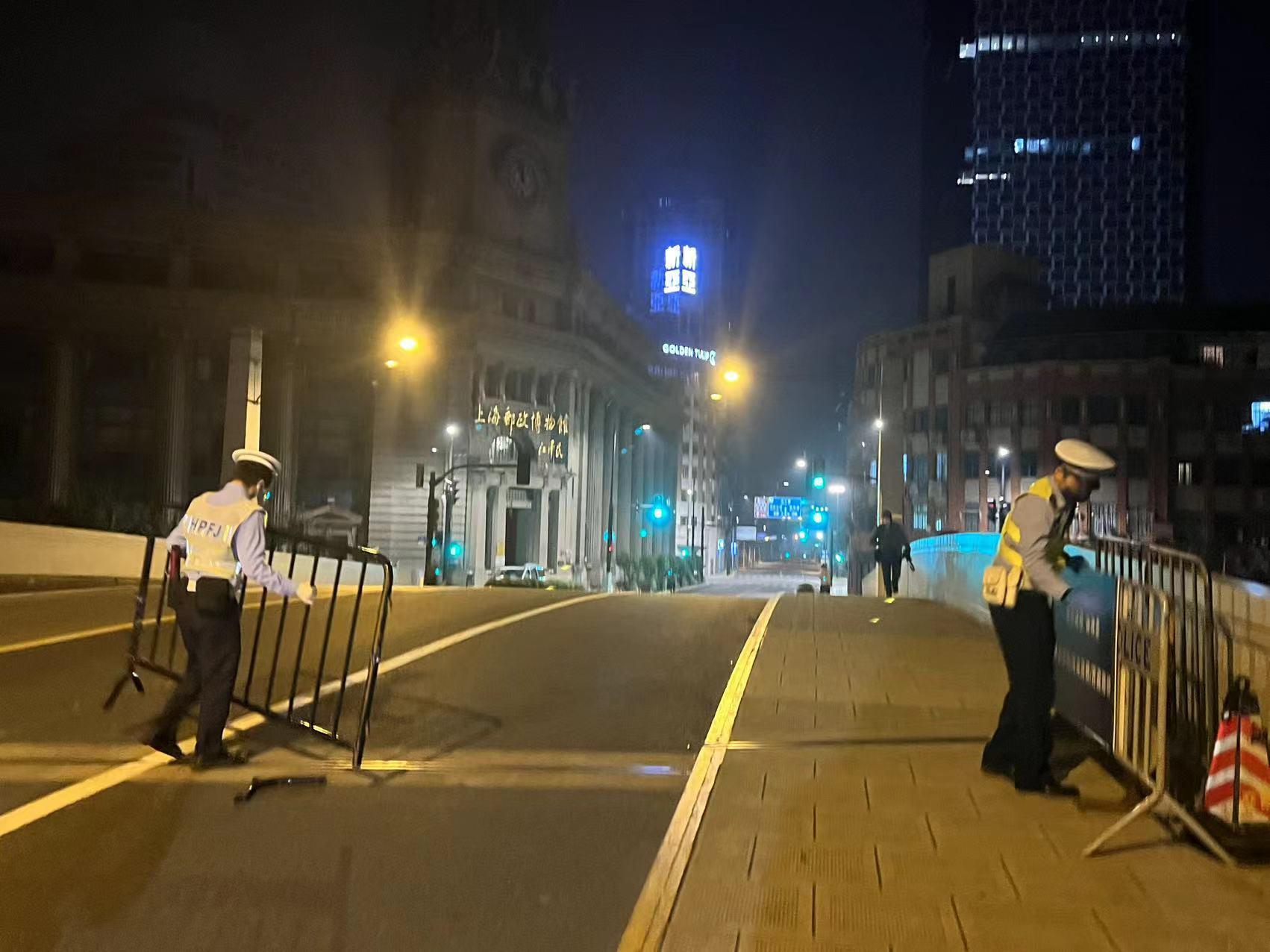 晚上11点55分,记者在连接黄浦区与虹口区的四川路桥看到,黄浦交警正在对设置在桥中央的路障进行拆除。四川路桥是连接两区的重要交通通道之一,从今天开始恢复运营的公交37路会从这里经过。