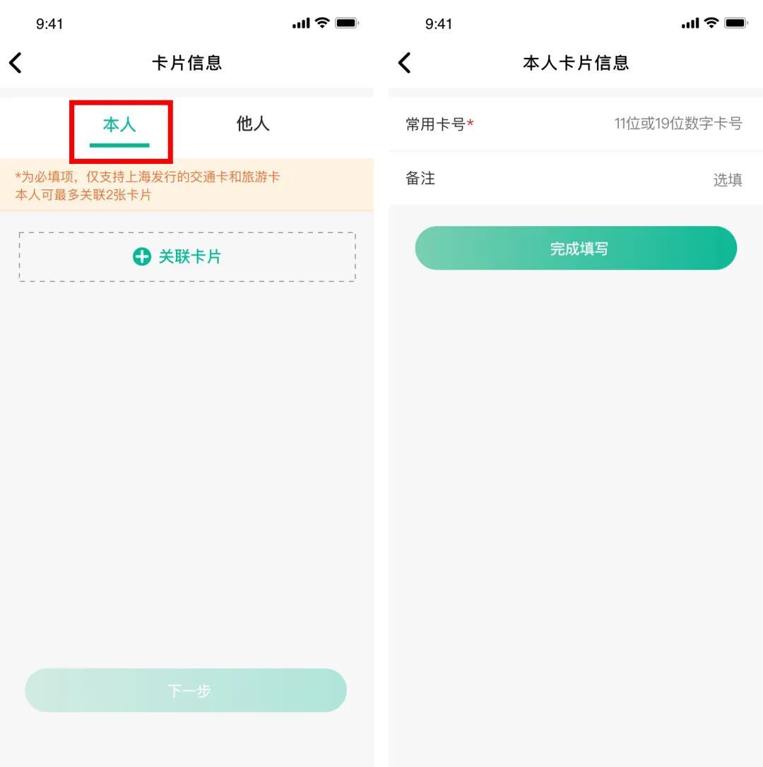1.您可输入关联您本人或他人(老人、视障人士、学生、幼龄儿童等特殊群体)常用的上海公共交通卡或上海都市旅游卡,您为本人可最多关联2张卡片。