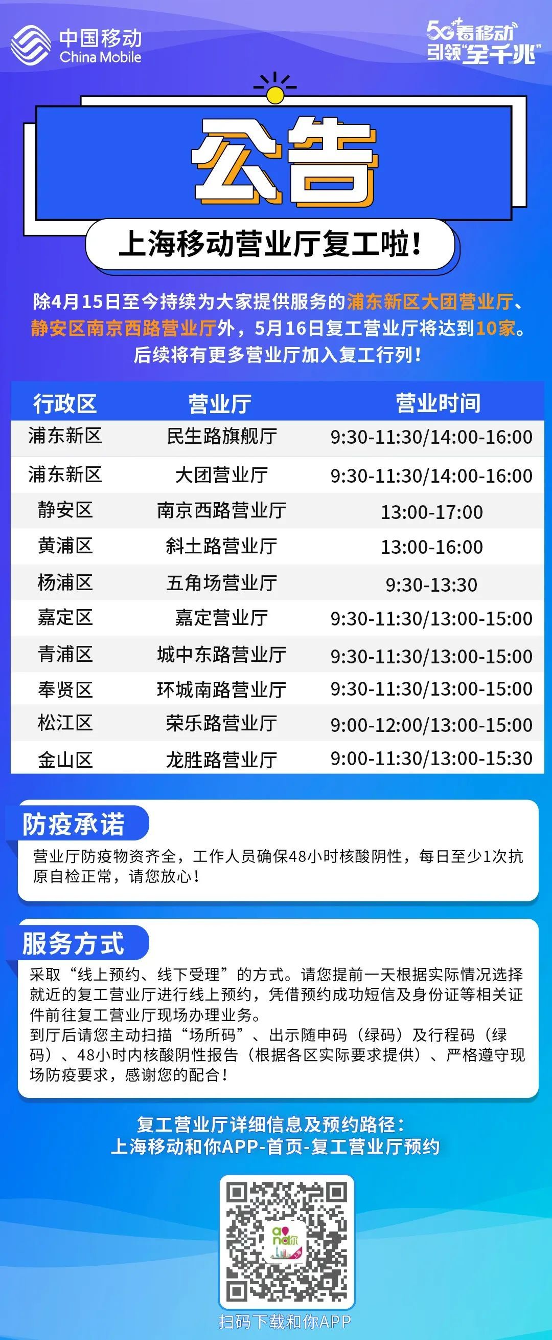 “目前营业厅主要针对一些紧急业务进行办理,如补换卡、停复机等。”上海移动松江分公司相关负责人介绍,此次复工营业厅的营业时间为每日9:00-12:00和13:00-15:00,一周7天均正常营业,相关业务办理采取线上预约、线下受理的方式。用户可根据实际情况选择就近复工营业厅进行预约,预约成功后会收到短信,届时即可凭借预约短信、身份证等相关证件前往复工营业厅现场办理业务。如有疑问,也可拨打营业厅联系电话或10086咨询。