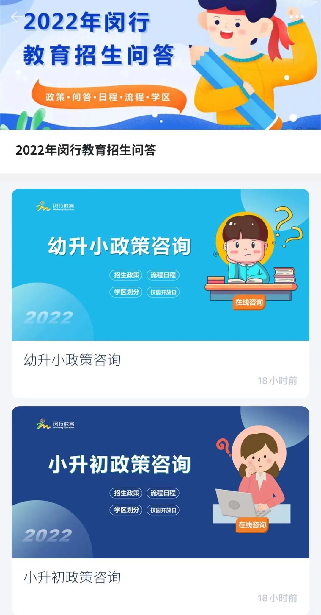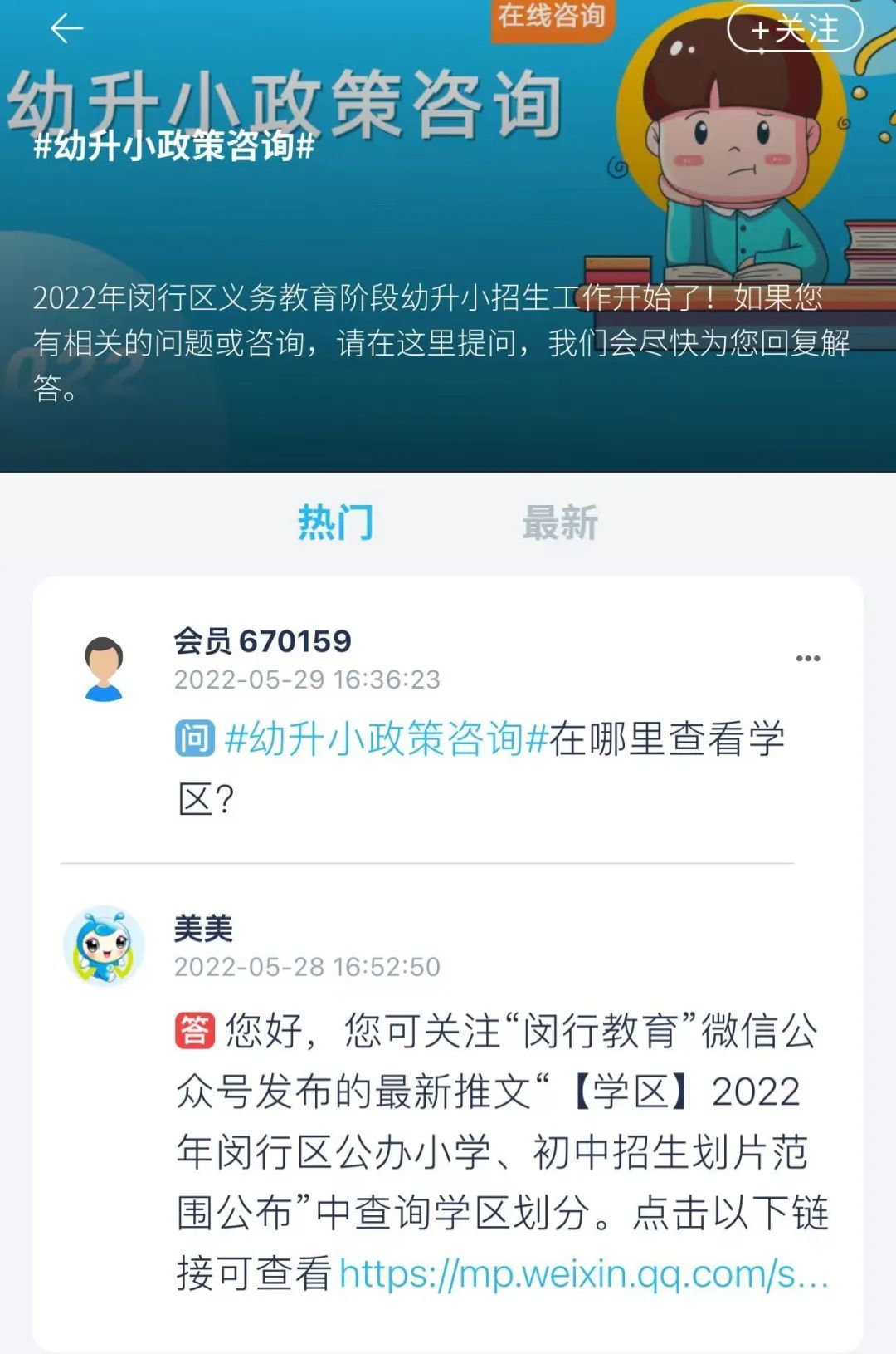 有关招生入学,区教育局与区融媒体中心在“今日闵行”APP联合推出了政策查询及招生问答频道,您可以登录“今日闵行”APP一站式查询或提问。