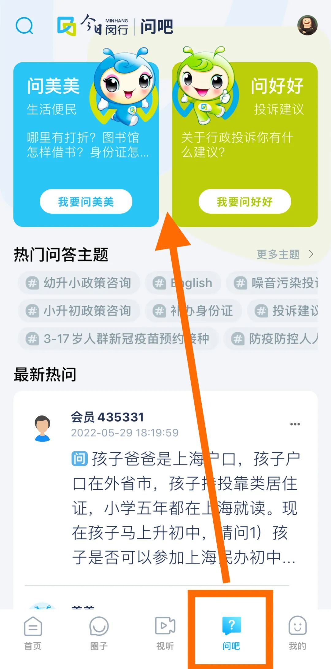 1、登录“今日闵行”APP,见首页,点击右下角“问吧”。