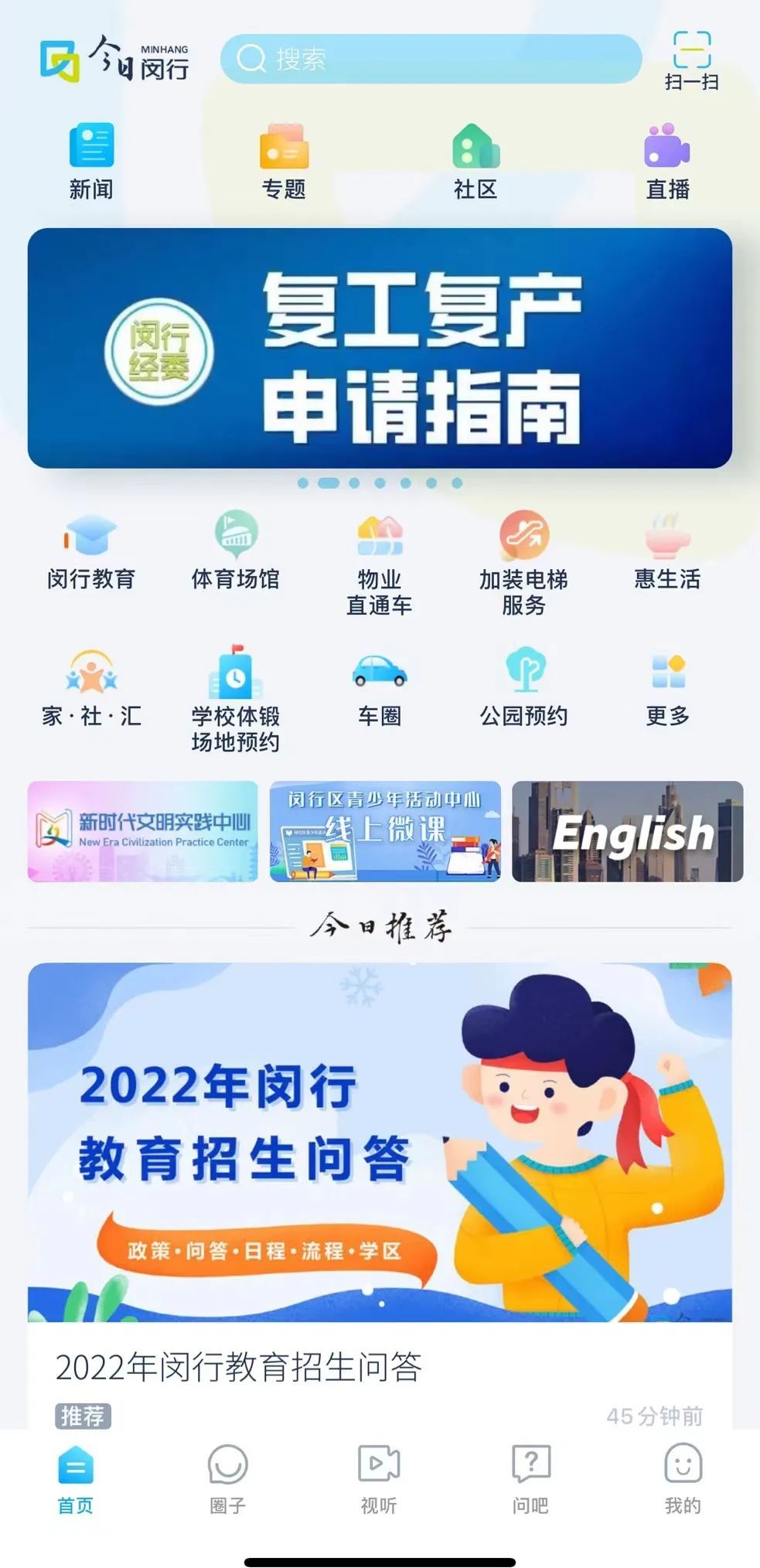 1、打开“今日闵行”APP,首页可见招生问答版块。