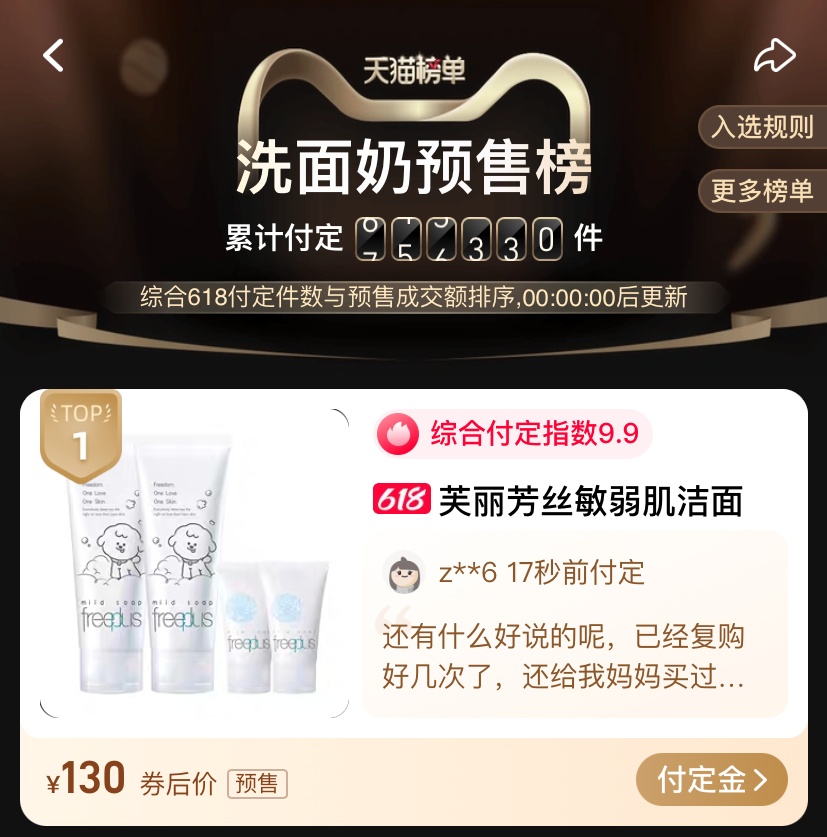预售首日,“吕”天猫官方旗舰店成交超10.1万瓶,是去年同期的52倍;洗护品牌“芙丽芳丝”则登上天猫洗面奶预售榜榜首,成为连续6年蝉联洁面类目第一的口碑品牌。“受疫情影响,消费者的囤货需求提升,大套装、组合装更吸引用户的关注。”丽人丽妆相关负责人表示,今年“618”开启后,丽人丽妆便以敏锐的需求洞察和精细化运营,助力多品牌官方旗舰店收获了确定性增长,多款爆品、新品持续受到消费者关注。