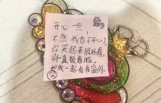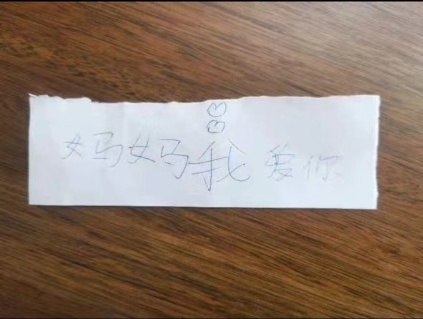 那时,爸爸发来了一张照片,是孩子偷偷写的一行字——“妈妈,我爱你。”上面还画了两颗爱心。看到字条,我泪流满面。