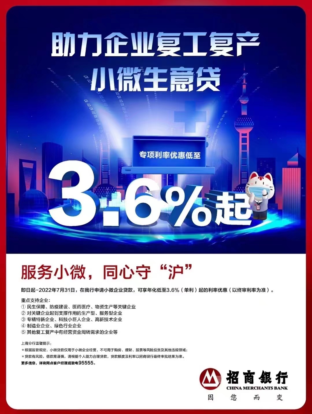 复工复产阶段,招商银行上海分行将重点支持:民生保障、防疫建设、医药医疗、物资生产等关键企业;对关键企业起到支撑作用的生产型、服务型企业;专精特新、科技小巨人、高新技术企业;制造业、绿色行业企业以及其他复工复产中有经营周转需求的企业等。招商银行积极主动降价让利,将切实为沪上小微企业提供实惠的信贷支持,帮助企业快速重启正常经营。
