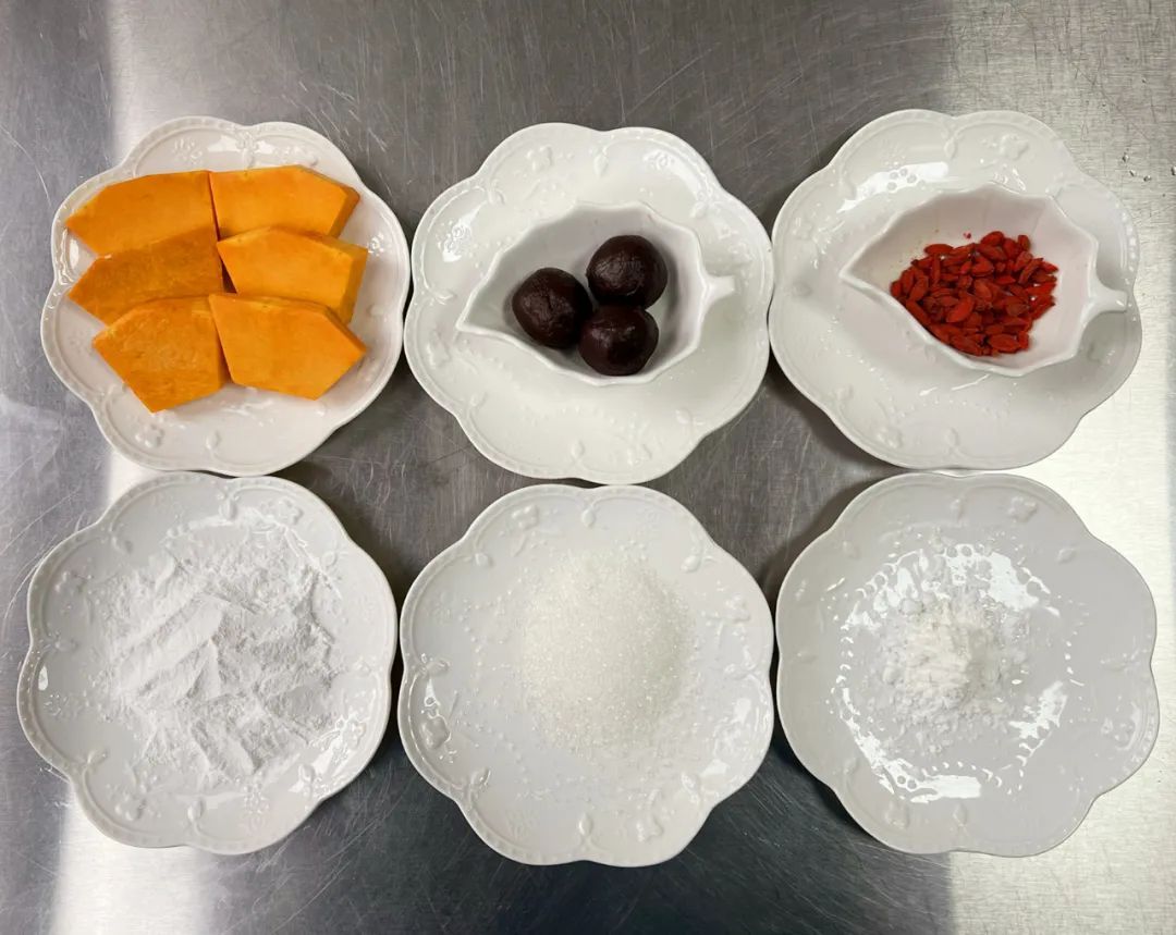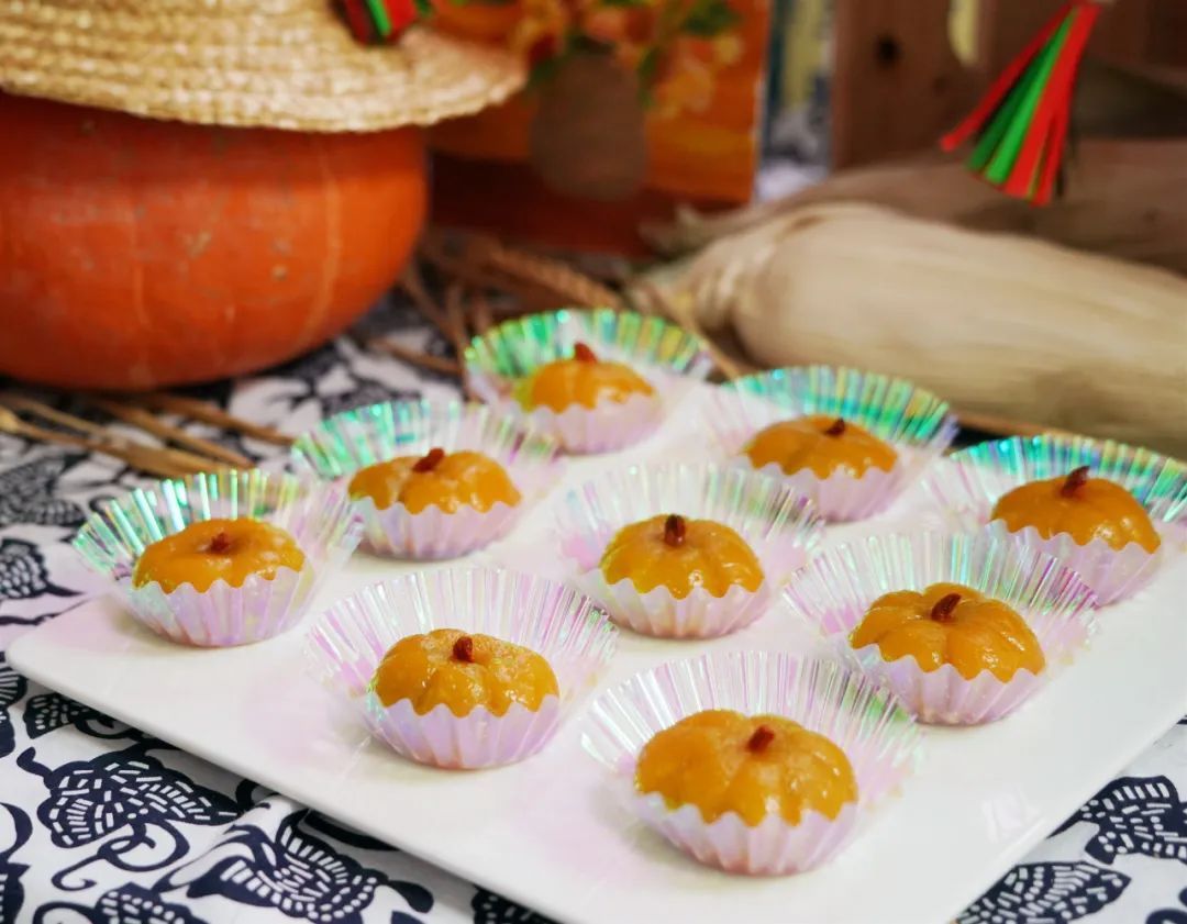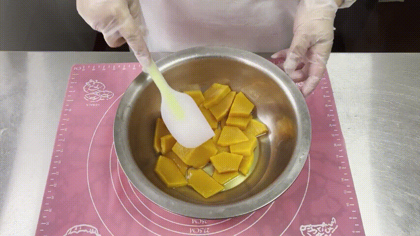 南瓜去皮切成小块,上锅蒸30分钟左右,将其压成泥。