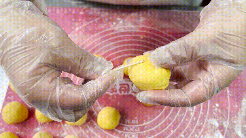 取一个个小团,中间放入豆沙,揉成球状备用。