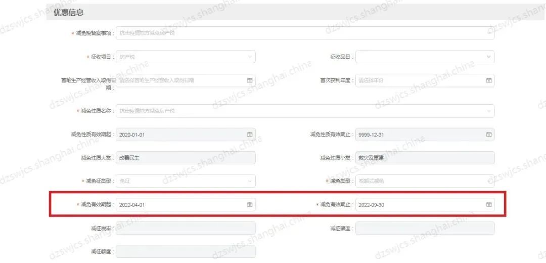 如:申请疫情期间减免自用房产房产税减免期为2022.4-2022.9;