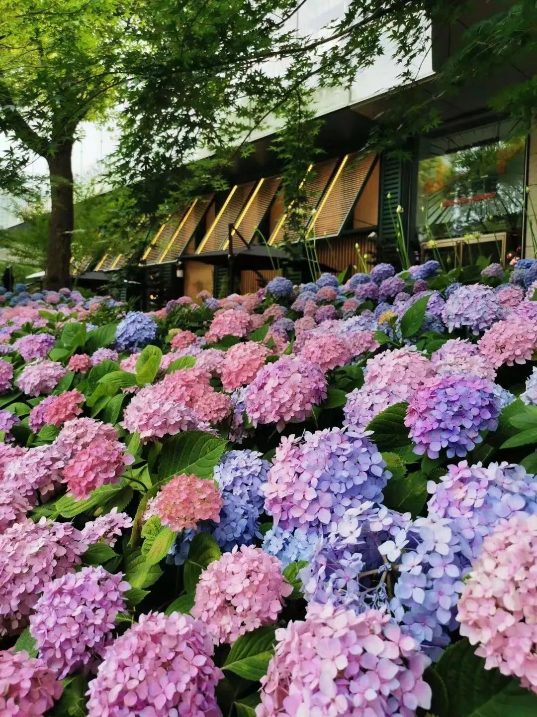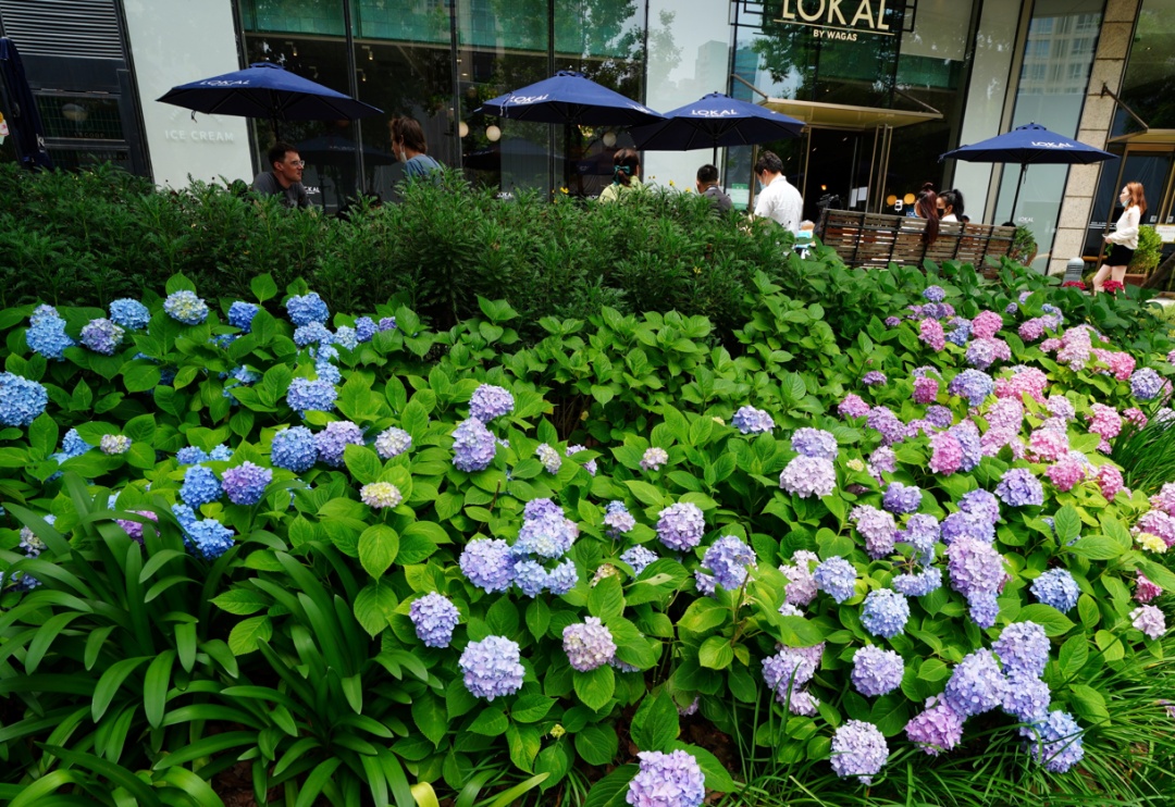 没想到,新天地太平湖边的绣球花那么多、那么美!湖滨道这里半条街都是蓝紫色的绣球花,有些区域还特别在花丛中辟出一小块空地,便于游人走进其中拍照打卡!