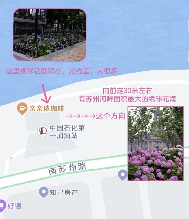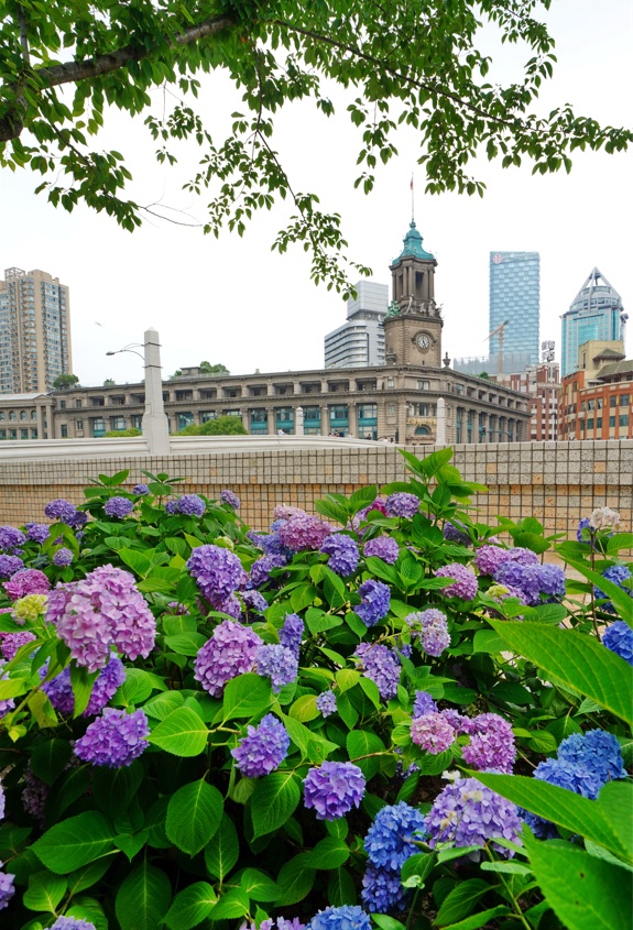 苏州河畔开满了紫色、粉色的绣球花,蝴蝶飞舞其中,引来不少人拍照。南苏州路邮政博物馆对面、中国石化第一加油站旁、四川路桥和南苏州中间,都是拍照的好去处!