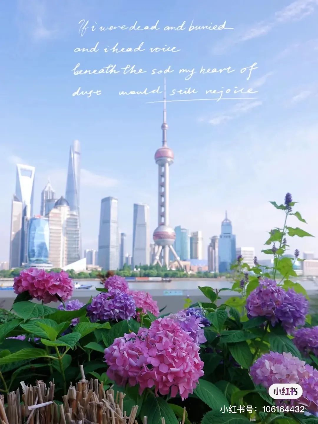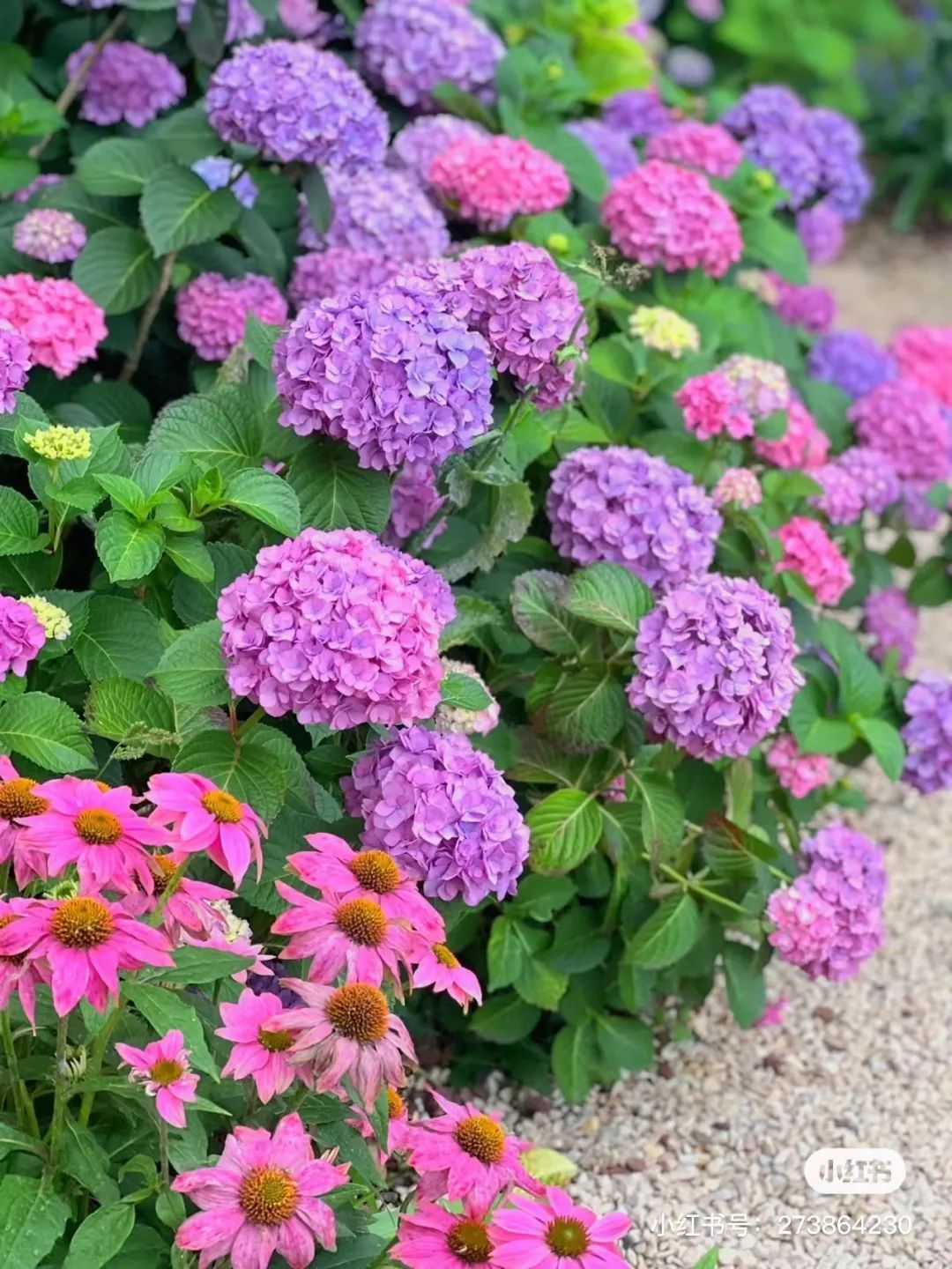 北外滩绿地的绣球花没有那么多,但在滨江风景的映衬下,能拍出不一样的大片。而且这里有一条铺满小石头的小径,路边都是绣球,很好拍!