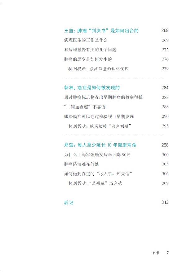 在本书中, 你将聆听到21位上海知名的肿瘤学临床、预防专家对常见的15种恶性肿瘤和遗传性肿瘤的真知灼见。在访谈中, 专家们集中讲解癌症的病因、危险因素、个人的风险、如何预防、如何早期发现、预防和早诊的效果等, 同时也邀请病理科、检验科的专家讲解广大患者对癌症相关检查认知上的常见误区。在内容编排上, 基本以肿瘤发病顺位为序。为了便于读者朋友们更好地理解、选择和付诸行动, 我们在专家访谈之后附录了上海市抗癌协会与复旦大学附属肿瘤医院向全社会发布的《居民常见恶性肿瘤筛查和预防推荐》中的相关建议及本人撰写的相关科普文章。我们相信, 这些努力一定会对你有所帮助。