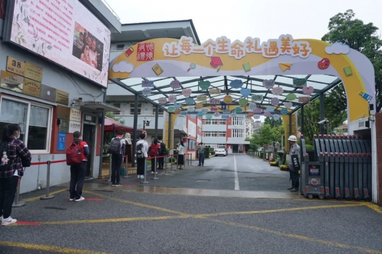 “让每一个生命礼遇美好”,上海市澧溪中学安装了崭新的入校连廊,挂满了温馨祝福语,让相隔2米有序排队入校的返校学子感到分外温暖。