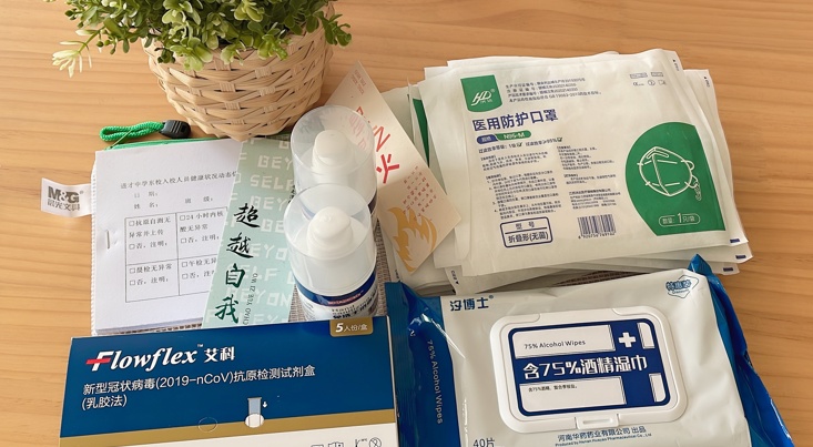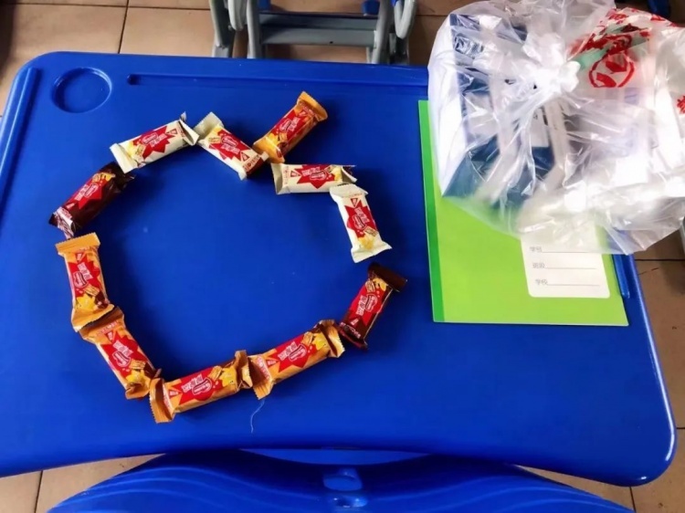 上海市金杨中学教师在131名初三学生的课桌上,提前摆放了爱心形状的巧克力威化和装有抗原检测试剂和N95口罩的防疫包,祝福这一届毕业生“甜蜜开启中考新征程”。