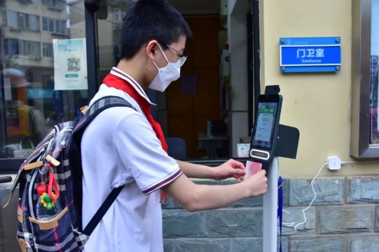 上海市陆行中学南校的学生入校前,扫一扫“数字哨兵”,核验体温、健康码和核酸记录。