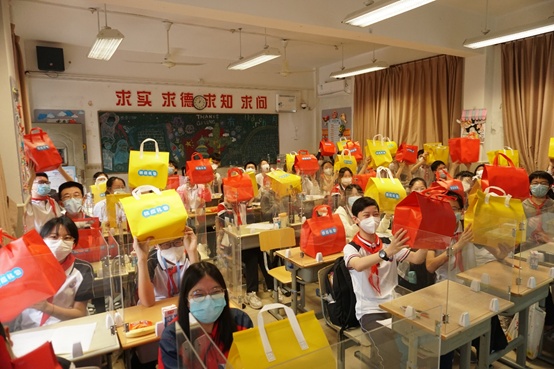 上海市澧溪中学的初三学生,走进教室就被红黄两色的防疫大礼包点亮了心情。